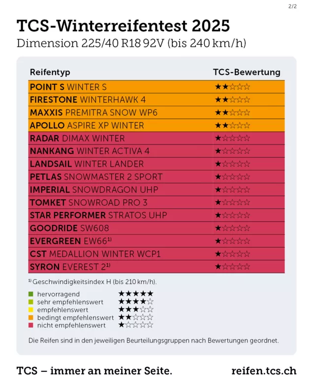 Mit dem Einbruch der kalten Jahreszeit ist es Zeit, das Fahrzeug mit Winterreifen auszurüsten. Um die Automobilistinnen und Automobilisten bei der Wahl zu unterstützen, hat der Touring Club Schweiz 31 Winterreifen der Grösse 225/40 R18 92V getestet. Mehr als ein Drittel der geprüften Reifen hat die Tests nicht bestanden und gilt als nicht empfehlenswert. Alle nicht empfohlenen Modelle sind die günstigsten im Test. Auf nasser Fahrbahn können die Bremswege der schwächsten Modelle um mehr als 15 Meter länger ausfallen – ein potenziell tödliches Risiko.
